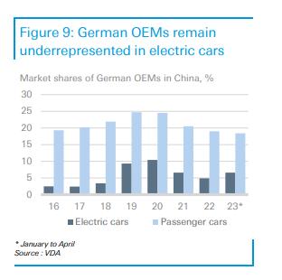 在中國,在2022年的汽車總銷量中電動汽車所占的市場份額接近28%(純電動汽車和插電式汽車)。德國品牌在中國電動汽車領域的市場份額相對較低(2022年僅為5 %)。中國制造商在更大程度上占據(jù)了中國市場。德國汽車制造商可能會繼續(xù)努力保護或擴大其在中國高端汽車領域的市場份額。對于德國汽車制造商來說,在量產(chǎn)車領域加劇競爭可能沒有什么意義,因為中國在規(guī)模經(jīng)濟方面已經(jīng)領先,而且消費者的接受程度可能已經(jīng)太高了。