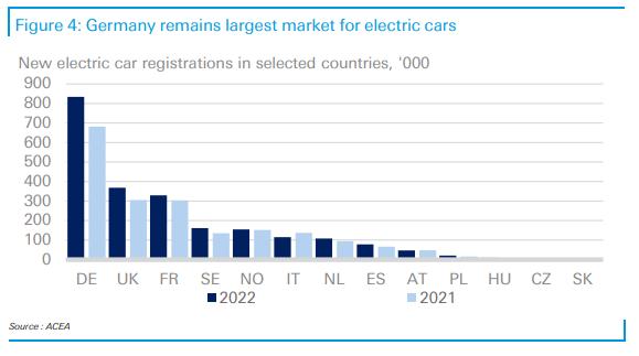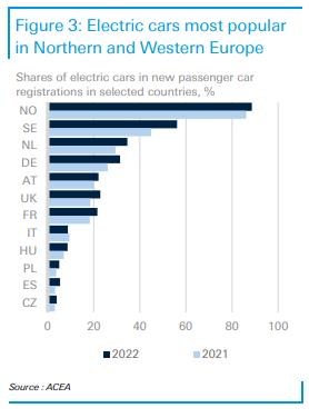 在歐洲,電動汽車增長勢頭強勁,2022年純電動汽車和插電式汽車市場份額為22.9%。在北歐,新注冊電動汽車的市場份額最高。電動汽車在東歐和南歐的市場份額仍然不足。購買價格高、收入低以及充電基礎設施不發(fā)達是造成這種情況的原因。