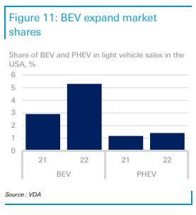 電動汽車在美國仍是一個小眾市場,但美國的監(jiān)管框架有所改善。與整體市場相比,德國品牌在美國電動汽車市場的份額相當高,2022年為11%。