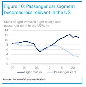 2022年,輕型車銷量(包括輕型卡車和乘用車)在美國下降了8%,約為1380萬輛。利率上升、供應鏈持續(xù)中斷和燃料價格上漲是造成這一現(xiàn)象的主要因素。前幾年,輕型車的銷量已經(jīng)呈下降趨勢。新冠肺炎疫情導致2020年美國市場大幅下滑,至今仍未復蘇。