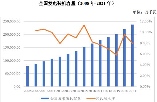近年來,我國發(fā)電裝機(jī)容量持續(xù)增長(zhǎng),風(fēng)電、核電以及太陽能發(fā)電等裝機(jī)規(guī)模增速較快。根據(jù)中電聯(lián)的統(tǒng)計(jì),截至 2021 年底,全國發(fā)電裝機(jī)容量 237,692萬千瓦,同比增長(zhǎng) 7.9%。其中,火電 129,678 萬千瓦,同比增長(zhǎng) 4.1%;水電 39,092萬千瓦,同比增長(zhǎng) 5.6%;風(fēng)電 32,848 萬千瓦,同比增長(zhǎng) 16.6%;核電 5,326 萬千瓦,同比增長(zhǎng) 6.8%;太陽能發(fā)電 30,656 萬千瓦,同比增長(zhǎng) 20.9%。