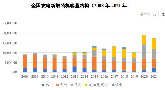 從總量和增速上看,近年來全國發(fā)電裝機(jī)容量逐年增長(zhǎng)。2021 年,全國新增發(fā)電裝機(jī)容量 17,908 萬千瓦,比上年少投產(chǎn) 1,236 萬千瓦。其中火電新增 4,939萬千瓦(煤電為 2,937 萬千瓦,氣電為 771 萬千瓦),比上年下降 12.7%;核電新增 340 萬千瓦,比上年增長(zhǎng) 203.9%;風(fēng)電新增 4,765 萬千瓦,比上年下降 33.9%;太陽能發(fā)電新增 5,454 萬千瓦,比上年增長(zhǎng) 13.1%。