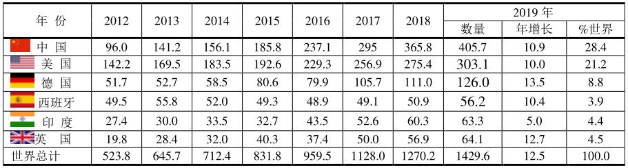 根據(jù)BP 2020年的報告,2019年全球風(fēng)電場年增長12.5%,發(fā)電量為1429.6TWh,其中發(fā)電量最多的國家是中國,中國于2016年超過美國,2019年增長10.9%,發(fā)電量為405.7 TWh,占全球風(fēng)電場發(fā)電總量的405.7/1429.6=28.4%。