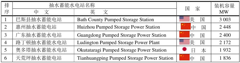 世界上第一座抽水蓄能電站是瑞士于1879年建成的勒頓抽水蓄能電站。當(dāng)今世界上最大的抽水蓄能電站是美國巴斯康蒂抽水蓄能電站,裝機容量達3003MW,其次為中國惠州抽水蓄能電站,裝機容量為2448 MW,廣東抽水蓄能水電站(Guangdong Pumped Storage Power Station),裝機容量為2400MW。