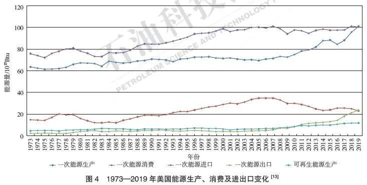 與歐洲的高比例可再生能源、激進的碳減排目標(biāo)政策不同,美國能源轉(zhuǎn)型是在實現(xiàn)“能源獨立”的前提下推動能源系統(tǒng)清潔化,以增加清潔能源(包括核電、可再生能源、天然氣和潔凈煤等)應(yīng)用比例為主要手段。2000年,美國和德國化石能源占一次能源消費總量的比例分別是85%和88. 6%,從這一角度來看兩國能源轉(zhuǎn)型起點相似;2018年,美國和德國可再生能源在一次能源消費量中所占比例分別為11.4%和16.6%,德國略勝一籌??v觀1973年以來美國的能源生產(chǎn)、消費和進出口情況,自2005年起,美國可再生能源和核電產(chǎn)量快速增長,清潔能源消費比例加速上升;2010以來,一次能源產(chǎn)量快速增長,并在2019年實現(xiàn)了“能源獨立”(圖4)。