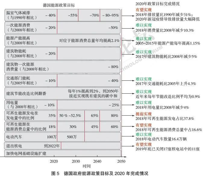 德國能源資源稟賦不佳,除了煤炭儲量相對豐富外,石油和天然氣高度依賴進口。德國能源轉(zhuǎn)型實踐始于21世紀(jì)初,確立了“能源安全、經(jīng)濟效率和環(huán)境可承受”的能源政策三大目標(biāo),核心思想是可持續(xù)發(fā)展。2000年,德國出臺《可再生能源法》,確定了可再生能源發(fā)展的多項激勵措施,并分別在2004年、2009年、2012年、2014年針對實際情況做出修訂和調(diào)整。2014年底,德國頒布《國家能效行動計劃》,對能源消費總量、建筑能效和交通能效等提出行動目標(biāo)??疾?020年之前所完成的半數(shù)轉(zhuǎn)型目標(biāo),與其他國家相比,德國是能源轉(zhuǎn)型的“優(yōu)等生”(圖5)。