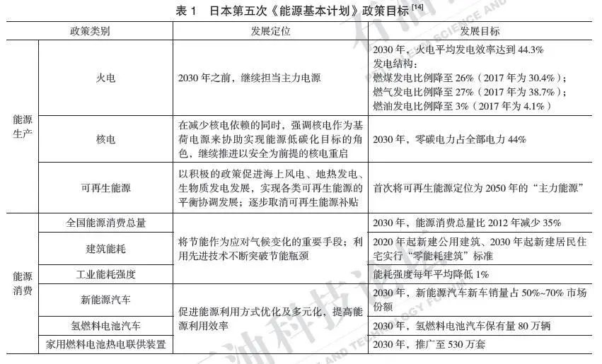 日本能源消費高度依賴進口,能源自給率低于10%,是發(fā)達國家中能源自給率最低的國家之一。日本能源轉(zhuǎn)型戰(zhàn)略的主要思路不拘泥于能源自給率,著力通過能源技術(shù)優(yōu)勢彌補資源稟賦的劣勢,將能源技術(shù)能力作為保障能源安全、穩(wěn)定能源供給、優(yōu)化能源結(jié)構(gòu)和提高產(chǎn)業(yè)競爭力的戰(zhàn)略性手段。2018年,日本發(fā)布了第五次《能源基本計劃》,提出了能源轉(zhuǎn)型戰(zhàn)略的新目標(biāo)、新路徑和新方向(表1)。
