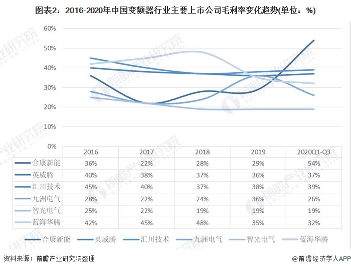 從我國上市公司近幾年的毛利率變化來看,變頻器行業(yè)主要上市公司的毛利率略有下降,但是整個(gè)行業(yè)的獲利水平較高,經(jīng)營效益良好。2018年,6家上市公司的毛利率維持在20%-50%之間;2019年,各公司的毛利率差異進(jìn)一步縮小,集中在30%-40%之間。2020年前三個(gè)季度,各公司的毛利率依然多集中在30%-40%之間。