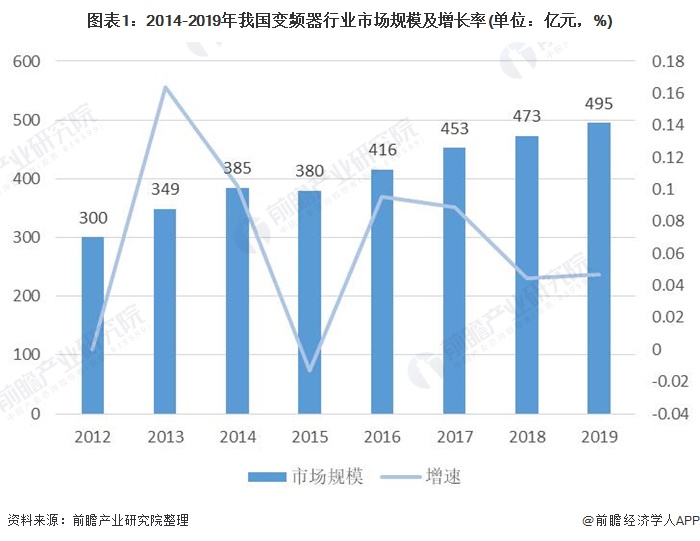 我國變頻器行業(yè)的市場規(guī)模整體呈上升態(tài)勢,從2012年至2019年,中國變頻器行業(yè)規(guī)模除2015年有小幅度下降以外,其余年份均處于穩(wěn)步增長狀態(tài)。2019年我國變頻器行業(yè)的市場規(guī)模達(dá)到495億元,相比2018年增長4.7%。