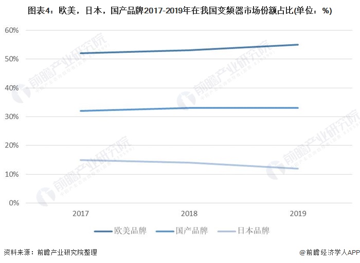 而中國國產(chǎn)變頻器企業(yè)這幾年市場份額一直在逐年增加。從各品牌的市場份額來看,外資品牌占據(jù)變頻器市場的主要份額,上世紀(jì)80年代日本企業(yè)率先進(jìn)入我國的變頻器市場,之后歐美品牌大量涌入,形成了歐美與日本品牌共同主導(dǎo)我國變頻器市場的競爭格局。近年來,進(jìn)口替代進(jìn)程正在不斷推進(jìn),國產(chǎn)企業(yè)正在逐步占據(jù)日本企業(yè)市場份額。從2017年至2019年日本變頻器行業(yè)市場份額逐年下降,國產(chǎn)品牌的上升且維持在33%左右,歐美品牌則依舊是變頻器市場份額占比最高的。2019年,歐美品牌市場份額占比為55%,國產(chǎn)品牌市場份額占比為33%,日本品牌的市場份額占比為12%。