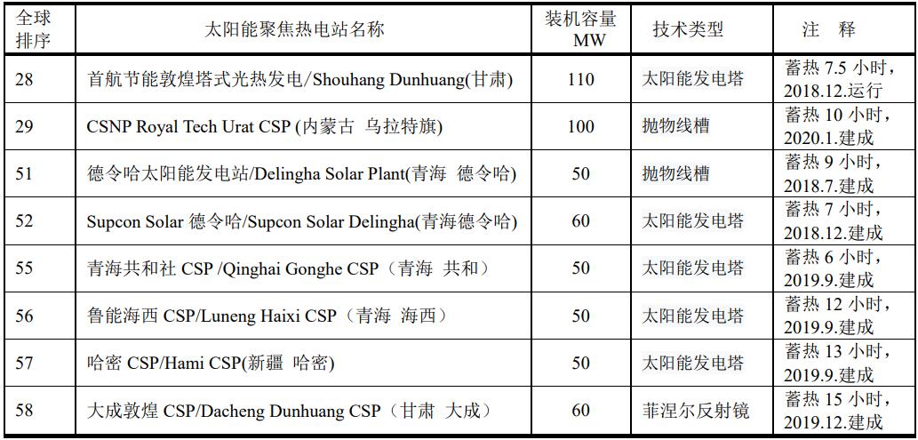 全球在建的裝機(jī)容量至少在50MW的太陽(yáng)能聚焦熱電站有7座,其中中國(guó)有6座。最大的是在阿聯(lián)酋迪拜—穆罕默德·本·拉希德·阿勒馬克圖姆太陽(yáng)能公園四期(Mohammed bin Rashid Al Maktoum Solar Park Phase IV),估計(jì)2021年竣工。中國(guó)在建的CSP如表。