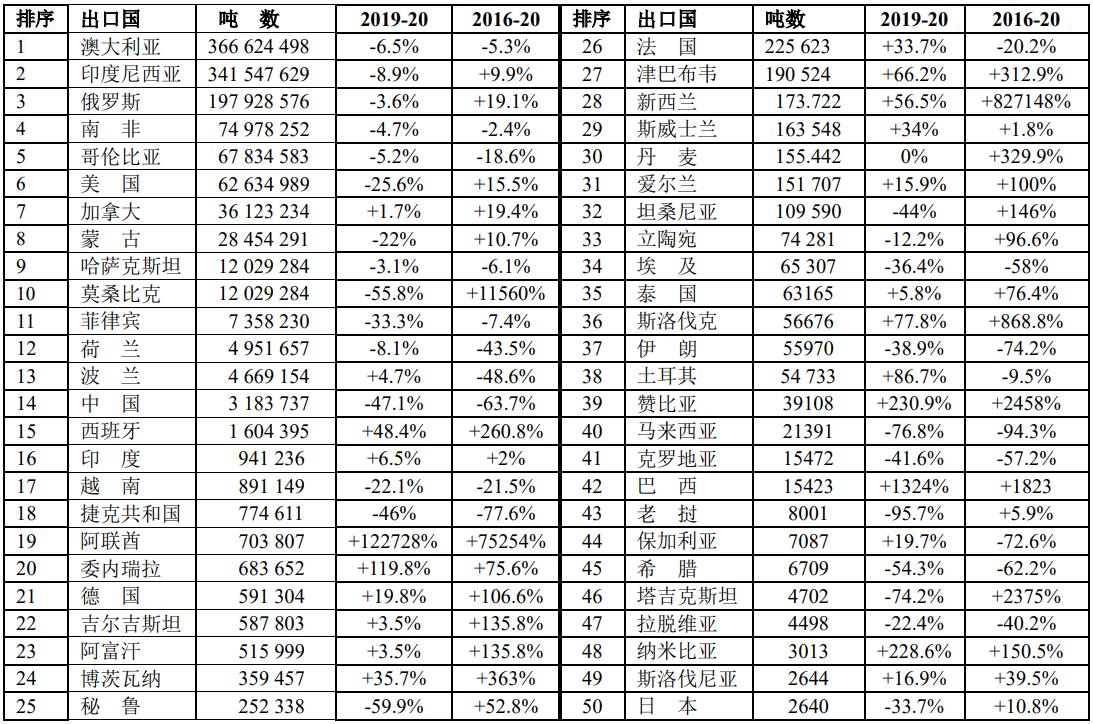 2020年原煤出口50位國(guó)家