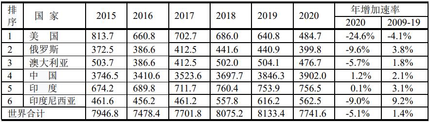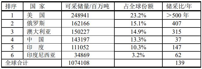 2020年全球原煤可采儲(chǔ)量前6位的國(guó)家
