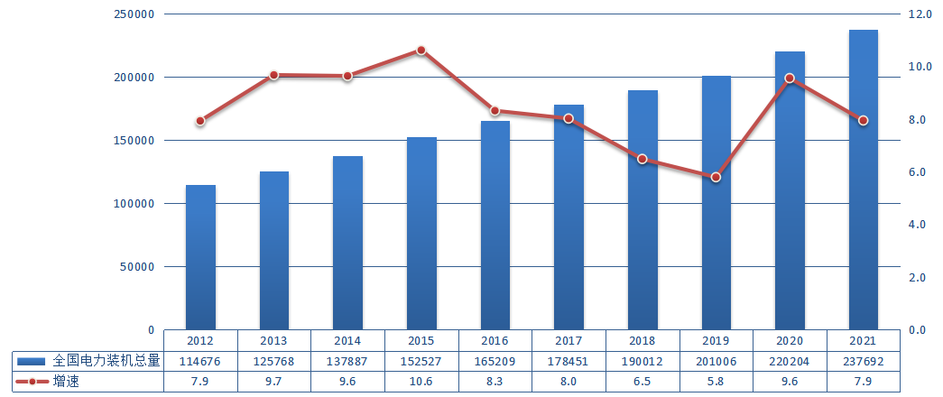 圖4 2012~2021年全國電力裝機及增速情況(單位:萬千瓦,%)