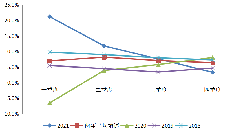 主要受到經(jīng)濟持續(xù)穩(wěn)定恢復(fù)和二產(chǎn)用電增長的拉動,一季度全社會用電量較快增長,拉動全年用電量同比增長4.5個百分點,較2019年同期增長14.4%。受能耗雙控和堅決遏制“兩高”項目盲目發(fā)展政策、同期基數(shù)抬升等因素影響,季度用電增速呈現(xiàn)“前高后底”態(tài)勢。通過對比可以看出,從2021年各季度兩年平均增速來看,增速略高于2019年,在2018和2019年之間。