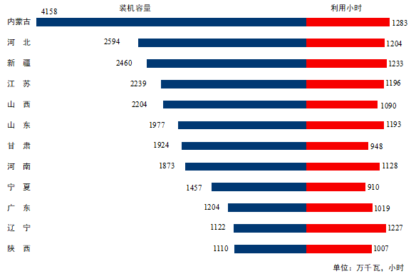 圖3 1-6月份風電裝機較多省份風電裝機容量和設(shè)備利用小時