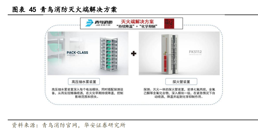 消防市場(chǎng)有望高速增長(zhǎng)。儲(chǔ)能消防市場(chǎng)規(guī)模=新增儲(chǔ)能裝機(jī)容量*儲(chǔ)能系統(tǒng)成本* 消防成本占比。隨原材料價(jià)格逐步回落與鋰電池儲(chǔ)能技術(shù)逐步提升,電化學(xué)儲(chǔ)能系統(tǒng) 成本將逐年降低,根據(jù) BNEF 測(cè)算,2025 年有望降至 1.4 元/Wh 左右。根據(jù)青鳥(niǎo)消防公告,目前消防占儲(chǔ)能系統(tǒng)成本約 3%,隨著風(fēng)光電高比例接入電網(wǎng),儲(chǔ)能利用率將 快速提升,進(jìn)而帶來(lái)更旺盛的消防需求,相應(yīng)消防成本占比逐年提升。儲(chǔ)能消防目前 單站價(jià)值量較低,行業(yè)未形成統(tǒng)一標(biāo)準(zhǔn)。預(yù)計(jì)隨《電化學(xué)儲(chǔ)能電站安全規(guī)程》正式稿 的出臺(tái),將有效帶動(dòng)行業(yè)規(guī)范發(fā)展,提升儲(chǔ)能消防產(chǎn)品質(zhì)量與數(shù)量,行業(yè)有望迎來(lái)供 需兩端同步改善。 國(guó)安達(dá):國(guó)安達(dá)為國(guó)內(nèi)特種消防龍頭,在滅火劑、驅(qū)動(dòng)劑、產(chǎn)品結(jié)構(gòu)等方面擁有 多項(xiàng)核心技術(shù)。近年來(lái)公司解決了新能源汽車鋰電池箱、特高壓換流站等特殊領(lǐng)域的 消防難題,并前瞻性布局電化學(xué)儲(chǔ)能消防產(chǎn)品。 國(guó)安達(dá)與國(guó)家電網(wǎng)有堅(jiān)實(shí)的長(zhǎng)期合作基礎(chǔ),自 2012 年開(kāi)始合作,于 2019 年 12 月 研發(fā)出變壓器固定自動(dòng)滅火系統(tǒng),2020 年 10 月通過(guò)了聯(lián)合驗(yàn)收,所使用的“壓縮空 氣泡沫滅火技術(shù)”最終確定為特高壓換流站的關(guān)鍵消防配套技術(shù)。同時(shí)與國(guó)家電網(wǎng)也 建立了緊密的合作研發(fā)關(guān)系。