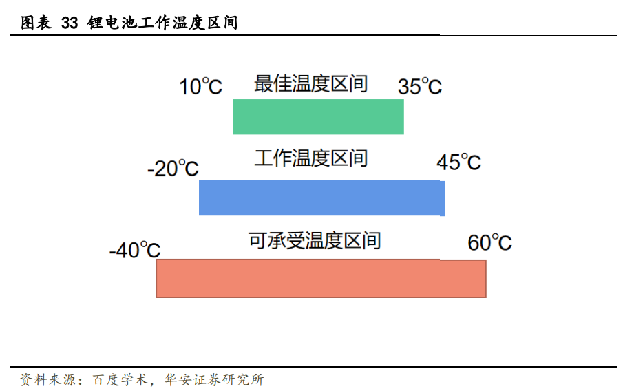 在高溫環(huán)境下,鋰電池內部的 SEI 膜首先分解,隨后負極材料與電解液產(chǎn)生反應、 隔膜熔融,最終正極材料及電解液發(fā)生分解。這些變化會導致鋰離子通道發(fā)生閉塞,引 起正負極直接接觸、短路,從而放出大量熱和氣體,導致內部壓力增加,發(fā)生如電池鼓 包、破裂、泄壓閥破裂、鋁箔熔化等熱失控現(xiàn)象。熱失控一旦發(fā)生,電池內部溫差可達 520 ℃,對安全性帶來嚴峻挑戰(zhàn)。此外,高溫會導致電池內阻增加、活性材料和有效鋰 離子流失,進而降低電池容量。 在低溫環(huán)境下,電池負極會析鋰形成鋰枝晶,嚴重時刺穿 SEI 膜,影響安全性。低 溫會導致電解液凝固,阻抗增加,進而降低電池容量,根據(jù)《鋰離子電池低溫特性研究 進展》,磷酸鐵鋰電池容量保持率 0 ℃下為 60%-70%,在−20 ℃時降低至 20%-40%。除 溫度外,電池間溫差亦會對電池性能產(chǎn)生影響。
