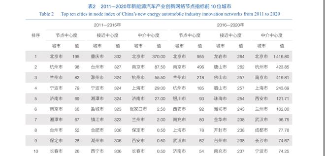 北京市、上海市和其他省會城市、首府城市是中國新能源汽車產(chǎn)業(yè)創(chuàng)新網(wǎng)絡中的核心節(jié)點,并具有引導其他城市共同開展新能源汽車專利合作的能力。由表2可知,北京市節(jié)點中心度自2011年以來始終是中國新能源汽車產(chǎn)業(yè)創(chuàng)新網(wǎng)絡中各城市的最高值,并且遠高于其他城市。這反映出北京市不僅在數(shù)量上擁有最多的新能源汽車產(chǎn)業(yè)專利,同時相對于其他城市,還與創(chuàng)新網(wǎng)絡中更多其他的節(jié)點城市開展了新能源汽車的創(chuàng)新合作。北京市在中介中心度上自2011年以來也保持著遠高于其他節(jié)點城市的數(shù)值。這反映了在新能源汽車產(chǎn)業(yè)創(chuàng)新網(wǎng)絡中,北京市擁有遠高于其他城市的在聯(lián)合其他兩個及兩個以上城市共同開展研發(fā)活動的能力。上海市的節(jié)點中心度和中介中心度自2011年以來上升顯著。同時,杭州市和南京市等其他長江三角洲城市群地區(qū)的城市也具有較高的節(jié)點中心度和中介中心度。結合圖1可知,在長江三角洲城市群地區(qū),上海市同其他城市已經(jīng)形成了復雜的新能源汽車產(chǎn)業(yè)創(chuàng)新網(wǎng)絡,同樣具有聯(lián)合其他兩個及兩個以上城市共同開展研發(fā)活動的能力。此外,相較于2011—2015年,2016—2020年的節(jié)點中心度和中介中心度排名前10名的城市中省會城市和首府城市顯著增多,這是由于省會城市和首府城市在省內和自治區(qū)內通常擁有更多的政策傾斜和更為豐富的企業(yè)、科研資源。隨著參與到中國新能源汽車產(chǎn)業(yè)創(chuàng)新網(wǎng)絡中的城市逐漸增多,省會城市和首府城市更有能力與率先開展新能源汽車研發(fā)的城市開展合作,或者自主開展并引導其他鄰近城市參與新能源汽車的研發(fā)活動。