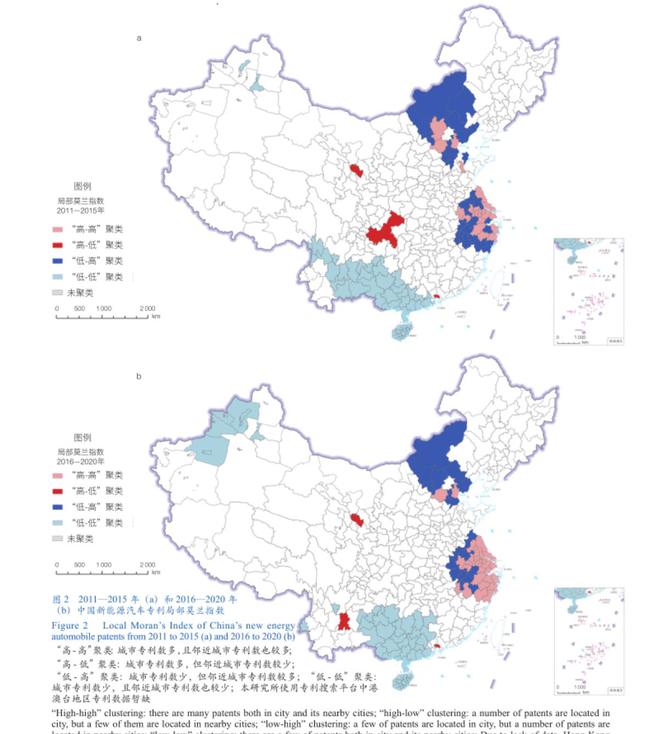 中國新能源汽車產(chǎn)業(yè)有效專利在城市間存在一定的空間集聚現(xiàn)象,并且集聚程度有上升趨勢。由表3可知,2011—2015年和2016—2020年中國新能源汽車專利的全局莫蘭指數(shù)均通過了5%的顯著性檢驗,并且莫蘭指數(shù)均為正值,但整體較低,這表示中國新能源汽車的專利在城市間存在較弱的空間集聚現(xiàn)象。相較于2011—2015年,2016—2020年的莫蘭指數(shù)有所提升,這也反映出隨著更多城市參與到新能源汽車的研發(fā)中,專利申請的空間集聚現(xiàn)象逐漸凸顯。