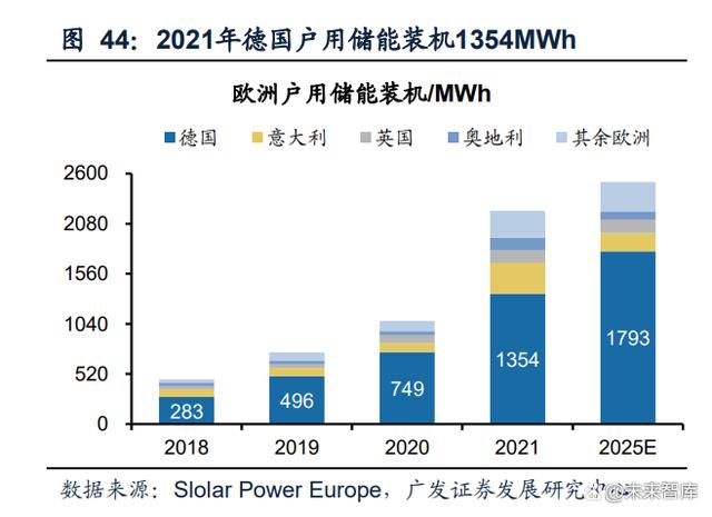 德國除保留火電裝機外,還積極發(fā)展儲能。與丹麥不同,德國用電規(guī)模大,風(fēng)光消 納面臨形勢更嚴峻,除了保留一定規(guī)模的火電裝機外,德國還積極發(fā)展儲能,儲能 規(guī)模排在歐洲國家前列,同時德國電網(wǎng)跨度大,儲能調(diào)度困難,因此重點發(fā)展戶用 儲能,2021年德國戶用儲能占歐洲比例達61%。