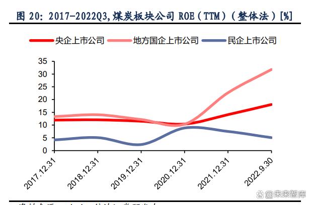ROE 數(shù)據(jù)方面,煤炭地方國企上市公司表現(xiàn)優(yōu)于央企上市公司。受益于煤炭價格的提升, 資產(chǎn)收益率在 2020 年后迎來了大幅度增長。民企上市公司整體表現(xiàn)弱勢,ROE 呈下降趨 勢,遠低于國企央企表現(xiàn)。PB 估值方面,2020 年后隨著企業(yè)經(jīng)營效益改善和煤炭板塊整體 股價的提升,國企央企上市公司的該項指標也有一定程度的增長,走勢與 ROE 接近。但考 慮到 ROE 的增長幅度更為明顯,我們認為 PB 的增長仍不足以完全反應企業(yè)效益增長的速 度。而煤炭行業(yè)在能源政策導向調(diào)整與電力市場化加速推進背景下,疊加新一輪煤礦產(chǎn)能周 期,供需或?qū)㈤L期趨緊,煤炭公司的高收益有望維持,內(nèi)在價值有望逐漸被市場認可,估值 有望迎來進一步修復。