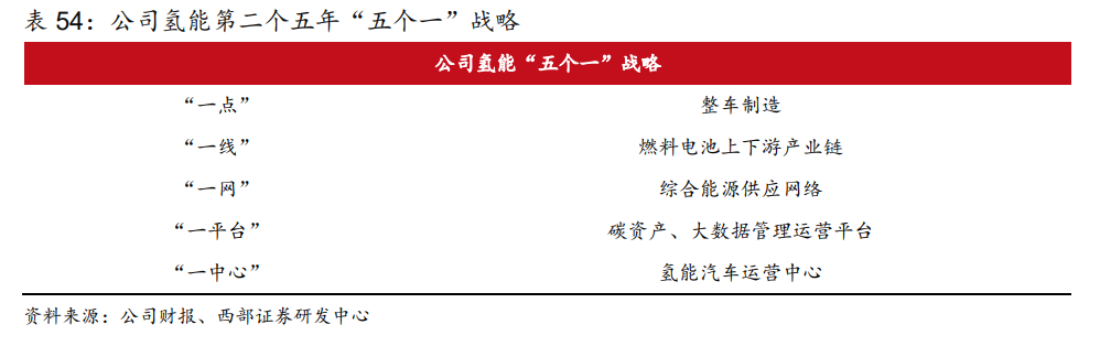率先布局氫能全產(chǎn)業(yè)鏈,全面啟動“五個一”戰(zhàn)略。公司于 2017 年在氫能產(chǎn)業(yè)鏈領(lǐng)先廣 泛布局,至 2021 年完成氫能發(fā)展的第一個五年規(guī)劃,目前已經(jīng)搭建了上游氫氣的“制-儲運-加”氫能供應體系、中游“膜電極-燃料電池電堆及系統(tǒng)-整車制造”核心裝備產(chǎn)業(yè)鏈,以及 下游六大區(qū)域氫能示范應用的三 維格局,形成從研發(fā)—生產(chǎn)制造—商業(yè)化應用的“氫能源 全生命周期”創(chuàng)新生態(tài)鏈。2022 年,公司啟動氫能產(chǎn)業(yè)第二個五年計劃,確立“五個一”戰(zhàn) 略。