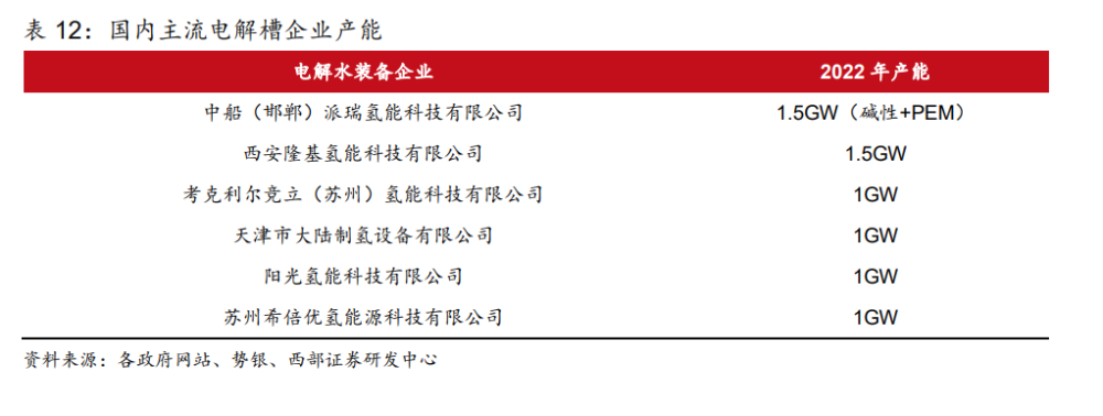電解水制氫是指水分子在直流電作用下被解離生成氧氣和氫氣,分別從電解槽陽極和陰極 析出。根據(jù)工作原理和電解質(zhì)的不同,電解水制氫技術(shù)通常分為四種,分別是堿性電解水 技術(shù)(ALK)、質(zhì)子交換膜電解水技術(shù)(PEM)、高溫固體氧化物電解水技術(shù)(SOEC)和 固體聚合物陰離子交換膜電解水技術(shù)(AEM)。 電解水制氫技術(shù)以堿性電解為主,PEM 電解次之。“雙碳”目標(biāo)提出后,國內(nèi)電解水制氫 項(xiàng)目規(guī)劃和推進(jìn)逐步加快,2022 年國內(nèi)堿性電解槽企業(yè)已披露產(chǎn)能接近 11GW,堿性電 解水制氫技術(shù)已完成商業(yè)化進(jìn)程,產(chǎn)業(yè)鏈發(fā)展成熟,且具備成本優(yōu)勢(shì),已實(shí)現(xiàn)大規(guī)模應(yīng)用; PEM 電解水技術(shù)則處于商業(yè)化初期,產(chǎn)業(yè)鏈國產(chǎn)化程度不足,電解槽雙極板、膜材料以及 鉑、銥等貴金屬催化劑材料成本更高且極度依賴進(jìn)口;高溫固體氧化物電解水技術(shù)和固體 聚合物陰離子交換膜電解水技術(shù)還處于研發(fā)示范階段,未實(shí)現(xiàn)商業(yè)化應(yīng)用。