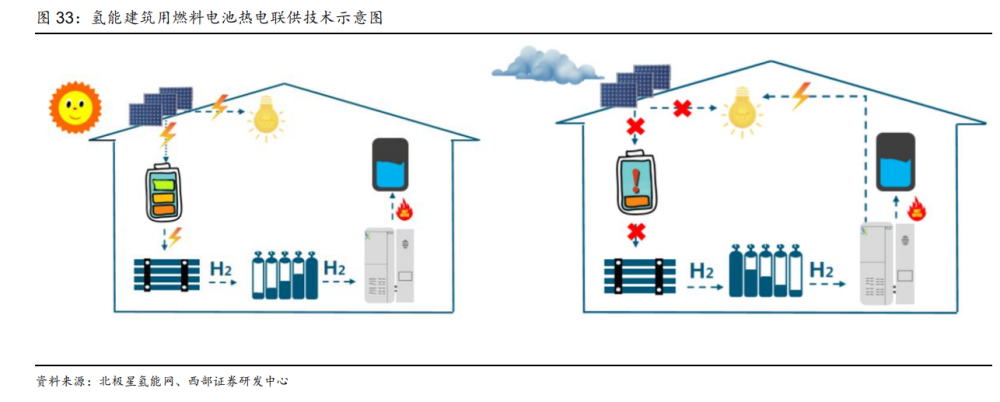 氫建筑應用仍處于導入階段,未來存在較大市場空間。氫能建筑,是近年發(fā)展起來的一種綠色建筑新理念。它以氫能完全或部分替代市政電網(wǎng)、天然氣等傳統(tǒng)能源,滿足建筑對冷、 熱、電、生活熱水等各種能源的需求,在提高建筑用電可靠性的同時,還有助于優(yōu)化國內(nèi) 的能源結(jié)構(gòu)、降低電網(wǎng)整體投資和減少問題氣體排放。 目前全球建筑供熱和電力需求約占全球能源需求的 1/3。全球多個國家積極探索氫能在建 筑領域應用,利用氫氣通過發(fā)電、直接燃燒、熱電聯(lián)產(chǎn)(CHP)等形式為居民住宅或商業(yè) 區(qū)提供電熱水冷多聯(lián)供。如氫可與天然氣混合(氫氣摻混比例為 0~20%),通過基于燃氣 輪機或燃料電池的 CHP 技術,利用現(xiàn)有建筑和能源網(wǎng)絡基礎設施提供靈活性和連續(xù)性的 熱能、電力供應,從而取代化石燃料 CHP。此外,100% 的純氫可通過氫鍋爐用于建筑 供熱,但氫氣價格需低至 1.5~3.0 美元/kg 時,才能與天然氣鍋爐和電動熱泵競爭。而對 于分布式供暖,氫能是少數(shù)幾種可以與天然氣競爭的低碳替代品,隨著制氫成本和氫鍋爐、 燃料電池成本的下降,以及氫氣利用現(xiàn)有天然氣管道輸送能力的提升,預計到 2030 年, CHP 中氫鍋爐與氫燃料電池的成本為 900~2000 美元/(戶·年),建筑熱電聯(lián)供的氫能 需求量為 3 萬~ 9 萬 t/年。