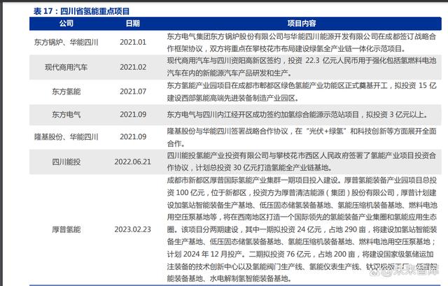近年來(lái)四川省不斷落地氫能投資項(xiàng)目,產(chǎn)業(yè)蓄勢(shì)待發(fā)。2021年以來(lái),四川省積極引導(dǎo)氫能項(xiàng)目投資落地:1)2021年2月24日,現(xiàn)代商用汽車在四川資陽(yáng)投資22.3億元,重點(diǎn)強(qiáng)化氫燃料汽車在內(nèi)的新能源汽車產(chǎn)品的研發(fā)和生產(chǎn);2)2021年7月9日,東方氫能在四川成都市郫都區(qū)投資15億元建設(shè)西部氫能高端先進(jìn)裝備制造產(chǎn)業(yè)園區(qū),主要目的是導(dǎo)入四川省燃料電池重點(diǎn)實(shí)驗(yàn)室,打造氫能科技創(chuàng)新中心、制造中心、科普中心、運(yùn)維服務(wù)及大數(shù)據(jù)中心、應(yīng)用示范中心,積極引入產(chǎn)業(yè)上下游企業(yè),構(gòu)建燃料電池核心原材料及核心零部件企業(yè)集群;3)2021年9月8日,東方電氣與四川內(nèi)江經(jīng)開(kāi)區(qū)簽約并擬投資3億元建設(shè)的加氫綜合能源示范站項(xiàng)目;4)2022年6月21日,四川能投氫能產(chǎn)業(yè)投資有限公司計(jì)劃在攀枝花市總投資30億元打造氫能全產(chǎn)業(yè)鏈基地。
