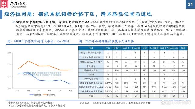 經(jīng)濟(jì)性問題:儲(chǔ)能系統(tǒng)招標(biāo)價(jià)格下壓,降本路徑任重而道遠(yuǎn)。儲(chǔ)能系統(tǒng)中標(biāo)價(jià)格不斷下探,專業(yè)化競(jìng)爭(zhēng)拉開序幕:以2小時(shí)磷酸鐵鋰電池儲(chǔ)能系統(tǒng)(不含用戶側(cè)應(yīng)用)為例,2023年6月儲(chǔ)能系統(tǒng)中標(biāo)均價(jià)為1082.00元/kWh,較1月下降25%。其中,華電集團(tuán)2023年第一批5GWh磷酸鐵鋰電化學(xué)儲(chǔ)能系統(tǒng)框架采購(gòu)項(xiàng)目競(jìng)爭(zhēng)最激烈,共56家企業(yè)參與競(jìng)逐。我們預(yù)測(cè)到2030 年,各類儲(chǔ)能技術(shù)的度電成本將實(shí)現(xiàn)10%以上的降幅。其中,如果2020-2030年鋰離子電池容量成本、功率成本下降 20%,2030 年其LOCE有望低于現(xiàn)階段最經(jīng)濟(jì)的抽水蓄能。