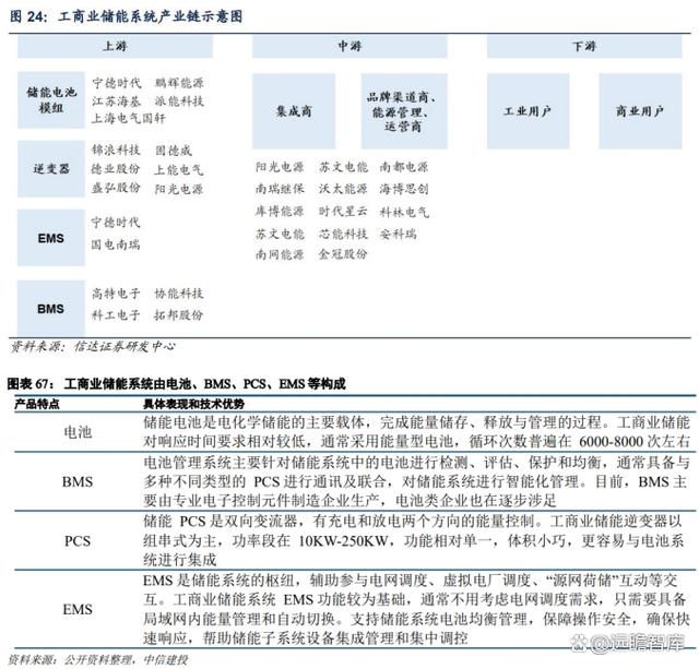 工商業(yè)儲(chǔ)能系統(tǒng)產(chǎn)業(yè)鏈完善,與大儲(chǔ)、戶儲(chǔ)同源。上游是各類設(shè)備,中游是系統(tǒng)集成商和開發(fā)運(yùn)營商,下游是工商業(yè)運(yùn)營商。上游部件環(huán)節(jié)中,儲(chǔ)能電池模組由電芯經(jīng)過串并聯(lián)組成用以儲(chǔ)存電力;逆變器進(jìn)行交流電與直流電的轉(zhuǎn)換,根據(jù)功率指令對(duì)電池進(jìn)行充放電;BMS 是控制、管理電池各項(xiàng)功能并保護(hù)電池的核心部件,亦具備和 EMS、SCADA(能量管理系統(tǒng)及監(jiān)控系統(tǒng))通訊功能,目前也有部分電池廠家開始自主設(shè)計(jì) BMS;EMS 控制逆變器并采集逆變器數(shù)據(jù)、控制電池模組并采集電芯數(shù)據(jù)、執(zhí)行邏輯(各種應(yīng)用)并與其他設(shè)備集成調(diào)度。中游集成商與品牌渠道商直接與下游工商業(yè)用戶對(duì)接,需要對(duì)BMS/EMS 系統(tǒng)及儲(chǔ)能應(yīng)用場景有著高理解,且 BMS/EMS 系統(tǒng)基本為自研,以完成對(duì)上游設(shè)備的高效整合。