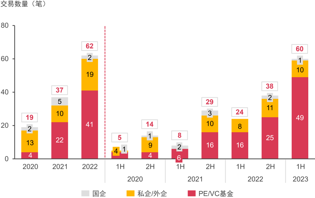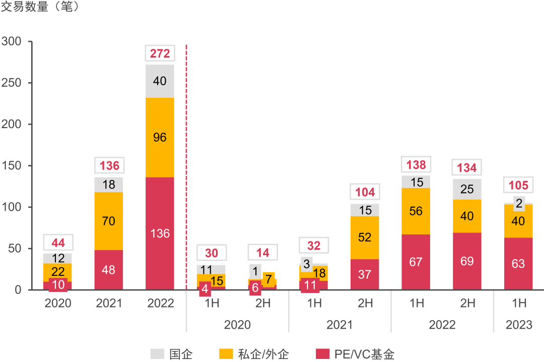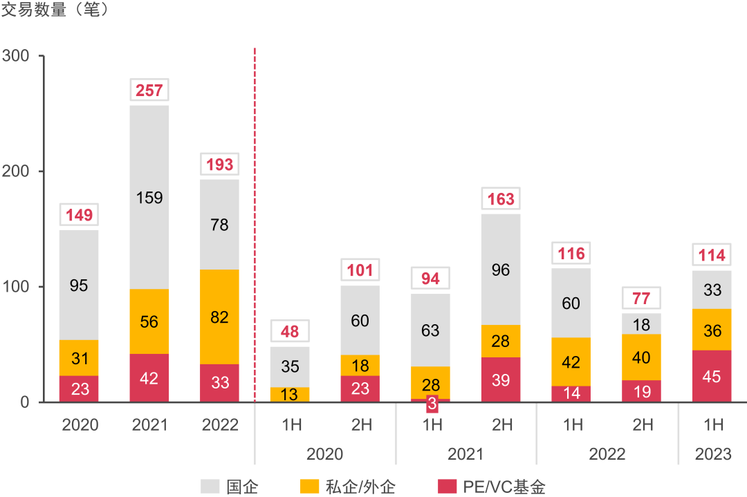 國企整體投資熱度有所下降,上半年僅有兩筆交易;顯示出國企對于行業(yè)成熟度提高后的投資謹慎性。