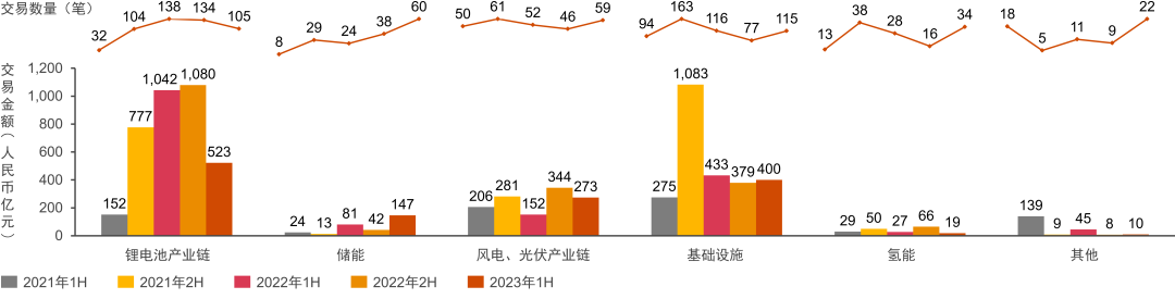 2021-2023年上半年中國新能源行業(yè)并購交易金額及數(shù)量(按細分賽道)