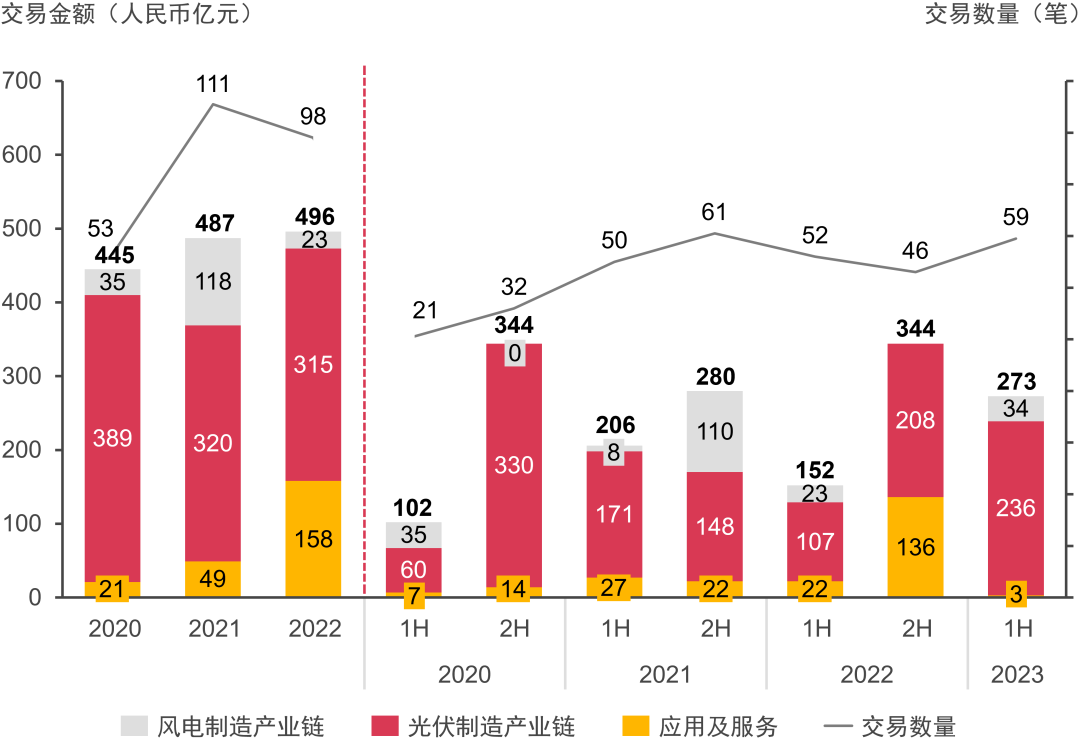 2020年至2023年上半年風電及光伏產(chǎn)業(yè)鏈并購交易數(shù)量及金額