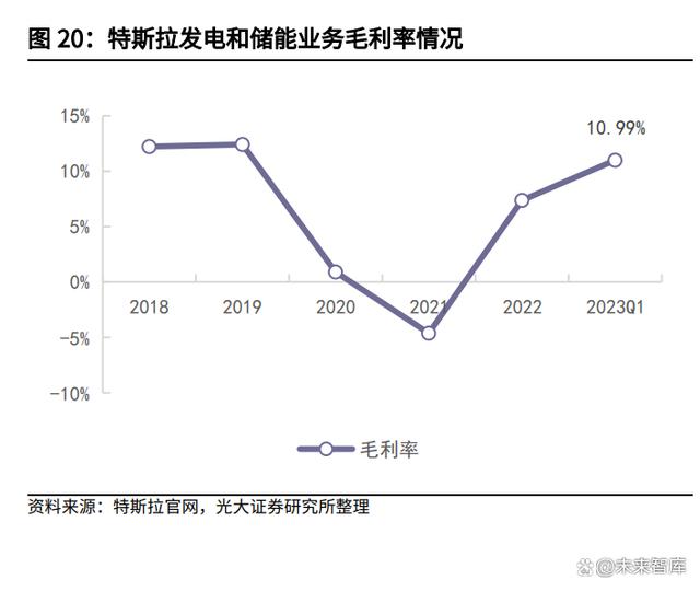 特斯拉發(fā)電和儲(chǔ)能業(yè)務(wù)營業(yè)收入除2019年外均穩(wěn)健增長,2020年到2022年增速均超過30%,發(fā)電和儲(chǔ)能業(yè)務(wù)毛利率在2019年-2021年有所下降,2022-2023第一季度明顯回升。在新能源大規(guī)模裝機(jī)和電網(wǎng)加大投資的背景下,家用級、商用級和公用級能源產(chǎn)品需求量不斷提升,儲(chǔ)能裝機(jī)量自2018年起逐年增加。2023年第一季度特斯拉該業(yè)務(wù)實(shí)現(xiàn)營業(yè)收入13.61億美元,同比增長148.21%,毛利率為10.99%。2023年4月,特斯拉宣布在中國上海新建儲(chǔ)能超級工廠(Megafactory),計(jì)劃于2024年第二季度投產(chǎn),初期規(guī)劃公用儲(chǔ)能電池年產(chǎn)量達(dá)1萬臺(tái),儲(chǔ)能規(guī)模近40GWh,和2022年相比產(chǎn)能直翻六倍多,儲(chǔ)能市場前景廣闊。