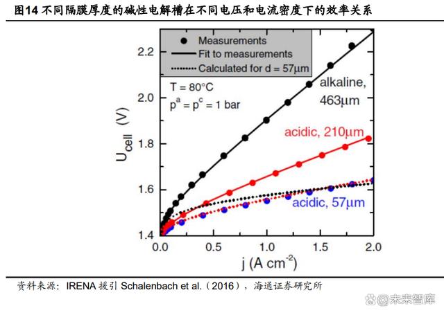減小隔膜厚度:可以提高效率并減少電力消耗。隔膜越薄,將 OH-從陰極運輸 到陽極的阻力就越低,但由于氣體滲透水平較高,從而可能導致安全問題。另 一個缺點是耐久性較低,因為隔膜中更有可能會形成針孔,導致機械魯棒性降 低??傮w而言,堿性電解槽的隔膜厚度應該接近 PEM 槽和 AEM 槽的水平。對 于 PEM 來說,目前最先進的膜厚度為 125-175 μm,并有潛力降低到 20 μm。 ALK 目前的隔膜厚度為 460 μm,將其降低到 50 μm 可以使堿槽在 1A/cm2 下 的效率從 53%提升到 75%。