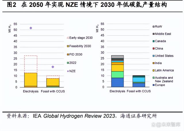2022 年全球氫氣總生產(chǎn)量約 9500 萬噸(同比+3%),其中中國產(chǎn)量占比 30%, 目前傳統(tǒng)化石燃料制灰氫仍為主要方式。2022 年全球氫氣總生產(chǎn)量約 9500 萬噸,同比 增長 3%,大部分氫氣通過傳統(tǒng)化石燃料生產(chǎn),其中天然氣制氫是最主要的制氫方法, 占產(chǎn)氫總量的 62%,其次為煤炭制氫占 21%,主要在我國,工業(yè)副產(chǎn)制氫占 16%。分 區(qū)域來看,全球氫產(chǎn)量的 70%集中在中國、美國、中東、印度和俄羅斯,其中中國由于 煉油和化工行業(yè)的需求氫產(chǎn)量約占全球的 30%。 目前低碳氫產(chǎn)量僅占 0.7%,IEA 預計到 2030 年低碳氫產(chǎn)量可達 2000 萬噸。2022 年全球低碳氫產(chǎn)量僅不到 100 萬噸,占氫氣總產(chǎn)量的 0.7%。其中電解水技術生產(chǎn)的綠 氫產(chǎn)量在快速增長,但 2022 年產(chǎn)量仍不足 10 萬噸,同比增長 35%。IEA 預測,假設已 宣布的建設項目全部投產(chǎn),到 2030 年,低碳氫產(chǎn)量可達 2000 萬噸,其中主要分布在歐 洲(30%)和澳大利亞(20%)地區(qū)。