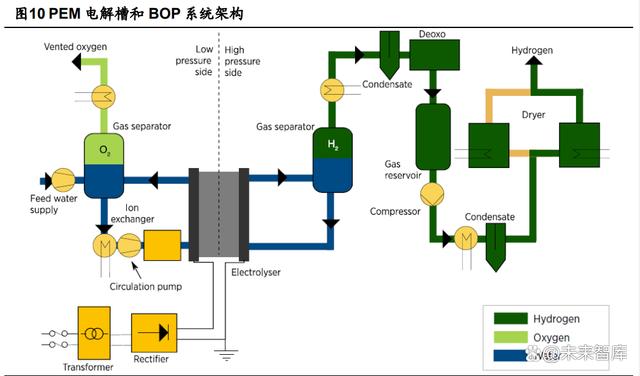 堿性電解槽需要將電解質(zhì)(KOH)再循環(huán)到電池組組件中,從而需要額外的堿液循 環(huán)泵,這個過程中會產(chǎn)生效率損耗(通常小于電堆功耗的 0.1%)。完成電解反應后,氫 氣和氧氣會在氣液分離系統(tǒng)中分別與堿液分離。補水系統(tǒng)負責保證水源的穩(wěn)定連續(xù)供給, 并且需要考慮隔膜的水滲透。此外,系統(tǒng)組件還包括后續(xù)的脫氧干燥系統(tǒng)等。