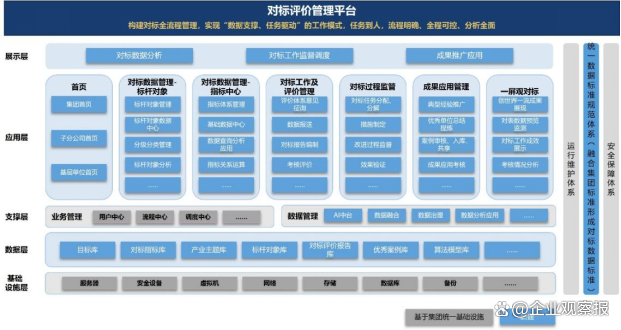 對(duì)標(biāo)平臺(tái)總體按照頂層規(guī)劃、集中部署、分層分級(jí)應(yīng)用、場(chǎng)景引導(dǎo)、上下協(xié)同、全面提升的建設(shè)原則開展集團(tuán)對(duì)標(biāo)評(píng)價(jià)管理平臺(tái)的規(guī)劃建設(shè)。依托集團(tuán)已有數(shù)據(jù)湖、數(shù)據(jù)中臺(tái)及技經(jīng)院的指標(biāo)體系設(shè)計(jì)成果,按照集團(tuán)數(shù)據(jù)治理平臺(tái)管控要求,實(shí)現(xiàn)集團(tuán)全層級(jí)對(duì)標(biāo)體系的規(guī)范化管理。在此基礎(chǔ)上,構(gòu)建面向各級(jí)不同對(duì)標(biāo)對(duì)象的對(duì)標(biāo)數(shù)據(jù)庫(kù),推進(jìn)集團(tuán)數(shù)據(jù)資源循環(huán)暢通、釋放數(shù)據(jù)要素資源價(jià)值。平臺(tái)縱向上,向下完成基層延伸,推進(jìn)子公司和基層單位對(duì)標(biāo)平臺(tái)融合接入集團(tuán)全層級(jí)對(duì)標(biāo)評(píng)價(jià)管理平臺(tái),打通各級(jí)子公司和基層單位系統(tǒng)間的“信息孤島”,構(gòu)建全集團(tuán)對(duì)標(biāo)評(píng)價(jià)的信息化生態(tài)圈;系統(tǒng)橫向上,實(shí)現(xiàn)與集團(tuán)智能設(shè)備、智能控制、智能生產(chǎn)執(zhí)行、管理支持、業(yè)務(wù)運(yùn)營(yíng)、戰(zhàn)略管控和決策等各領(lǐng)域業(yè)務(wù)系統(tǒng)的互聯(lián)互通,形成縱向貫通、橫向協(xié)同、覆蓋全集團(tuán)的“一體化對(duì)標(biāo)評(píng)價(jià)”體系。
