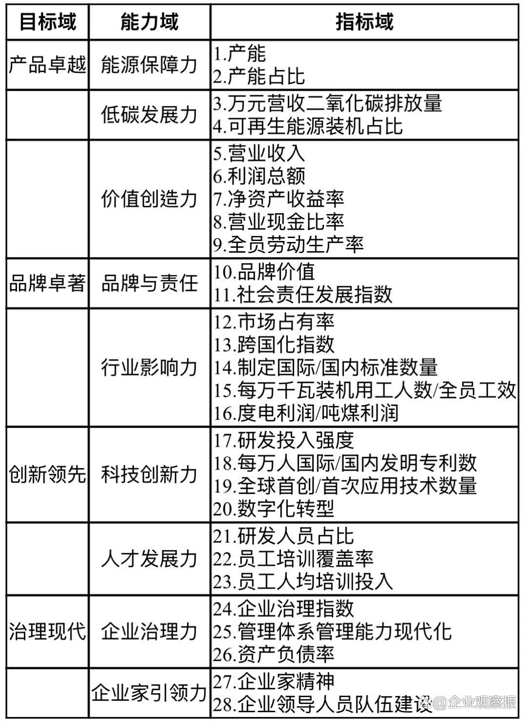 緊扣黨中央關(guān)于加快建設(shè)世界一流企業(yè)政策精神,結(jié)合國(guó)資委要求和企業(yè)發(fā)展戰(zhàn)略,基于對(duì)世界一流能源電力企業(yè)特征與發(fā)展趨勢(shì)研究,參考國(guó)內(nèi)外權(quán)威機(jī)構(gòu)研究成果,以世界一流企業(yè)建設(shè)“產(chǎn)品卓越、品牌卓著、創(chuàng)新領(lǐng)先、治理現(xiàn)代”的核心內(nèi)涵為目標(biāo),研究世界一流企業(yè)建設(shè)的目標(biāo)與關(guān)鍵能力之間的關(guān)系,再由每項(xiàng)關(guān)鍵能力延伸出具體關(guān)鍵指標(biāo)要素,從而構(gòu)建出世界一流能源電力企業(yè)對(duì)標(biāo)指標(biāo)體系,應(yīng)用于能源電力企業(yè)競(jìng)爭(zhēng)力的對(duì)標(biāo)分析評(píng)價(jià)。