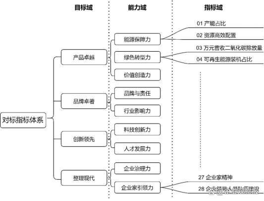“一個(gè)體系”,即構(gòu)建業(yè)績(jī)維度和管理要素并重的,滿足全集團(tuán)統(tǒng)一、多級(jí)貫通的世界一流企業(yè)對(duì)標(biāo)指標(biāo)體系。對(duì)標(biāo)指標(biāo)體系重點(diǎn)體現(xiàn)“產(chǎn)品卓越、品牌卓著、創(chuàng)新領(lǐng)先、治理現(xiàn)代”十六字標(biāo)準(zhǔn)和“創(chuàng)新力、競(jìng)爭(zhēng)力、治理力、影響力、引領(lǐng)力”五力要求,結(jié)合集團(tuán)未來發(fā)展方向、定位和目標(biāo)等進(jìn)行選擇和設(shè)置,通過分級(jí)分類建立集團(tuán)各級(jí)子公司的對(duì)標(biāo)指標(biāo)體系,形成涵蓋集團(tuán)公司綜合對(duì)比指標(biāo)體系及子分公司等若干產(chǎn)業(yè)特色共性指標(biāo),實(shí)現(xiàn)傳導(dǎo)壓力、激發(fā)動(dòng)力,進(jìn)而增強(qiáng)創(chuàng)建世界一流企業(yè)行動(dòng)的系統(tǒng)性、針對(duì)性和有效性。