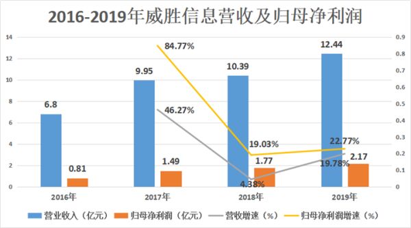 2019年威勝信息實現(xiàn)收入12.44億元,較同期增長了19.78%,三年的復(fù)合增長率達(dá)到11.81%;歸母凈利潤為2.17億元,較同期增長了22.77%,三年的復(fù)合增長率達(dá)到20.89%。