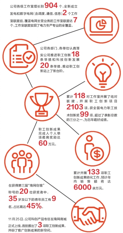 2019年,南方電網(wǎng)公司各部門、各單位認(rèn)真落實公司推進(jìn)職工創(chuàng)新的18條舉措和科技創(chuàng)新發(fā)展20條舉措,以工作室聯(lián)盟為抓手,進(jìn)一步整合全網(wǎng)職工創(chuàng)新力量,打造了更廣闊的創(chuàng)新協(xié)作平臺,為職工創(chuàng)新創(chuàng)造更好的條件;通過建章立制、搭建平臺,打通了創(chuàng)新成果轉(zhuǎn)化的“最后一公里”;通過開展培訓(xùn)、經(jīng)驗交流、成果展覽,使優(yōu)秀成果及創(chuàng)新經(jīng)驗實現(xiàn)了共享。今年,公司在職創(chuàng)實施、項目獲獎、成果轉(zhuǎn)化等方面,創(chuàng)造了南網(wǎng)職創(chuàng)新高度。