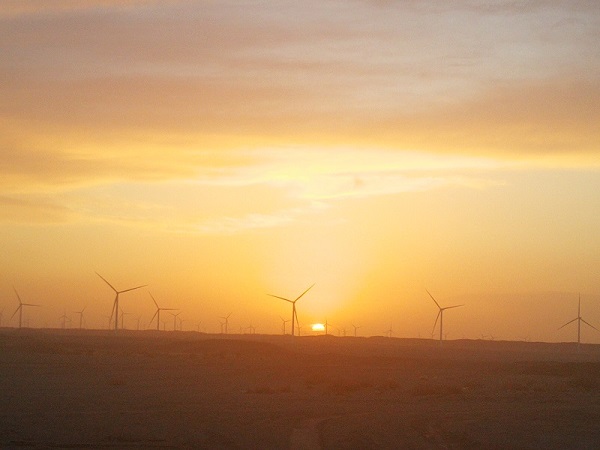工作了一天,我們會(huì)在晚上看落日晚霞,戈壁灘上的落日很大,輪廓分明而清晰,隨著時(shí)間的推移,太陽慢慢的落進(jìn)了地平線里,此時(shí)的天空呈現(xiàn)出紅黃綠藍(lán)的漸變顏色,柔和而美麗,風(fēng)機(jī)的輪廓也映襯著更加的鮮明可見,放眼望去,只看見千百臺(tái)風(fēng)機(jī)在轉(zhuǎn)動(dòng),使人心曠神怡。