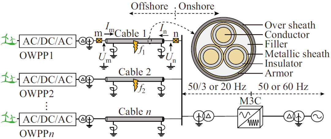 圖1給出了海上風(fēng)電低頻輸電系統(tǒng)拓?fù)洌@|需匯集來(lái)自于風(fēng)電場(chǎng)的電能,并經(jīng)模塊化多電平矩陣換流器(modular multilevel matrix converter,M3C)實(shí)現(xiàn)頻率轉(zhuǎn)換,從而在M3C低頻側(cè)構(gòu)成了100%電力電子源場(chǎng)景。相較于同步機(jī)系統(tǒng)在負(fù)序網(wǎng)絡(luò)中源側(cè)只體現(xiàn)阻抗特性,低頻輸電系統(tǒng)負(fù)序網(wǎng)絡(luò)中線路兩側(cè)均可體現(xiàn)為電源特性。根據(jù)單相接地故障和兩相相間故障復(fù)合序網(wǎng)圖,故障支路電流可由負(fù)序電流唯一確定,當(dāng)M3C和海上風(fēng)電場(chǎng)網(wǎng)側(cè)變流器(grid-side converter, GSC)抑制負(fù)序電流時(shí),盡管故障點(diǎn)處存在負(fù)序電壓源,但兩側(cè)換流器均會(huì)生成幅值相位相同的電壓源,以抵消系統(tǒng)中的負(fù)序電流,因此系統(tǒng)故障電流仍保持對(duì)稱(chēng),使得故障支路的穩(wěn)態(tài)電流為0。上述分析表明,雖然風(fēng)電場(chǎng)升壓變壓器和M3C低頻側(cè)隔離變壓器網(wǎng)側(cè)中性點(diǎn)均采取直接接地方式,但低頻輸電系統(tǒng)在特定故障控制策略下呈現(xiàn)出類(lèi)似于中性點(diǎn)非直接接地系統(tǒng)的故障特征。