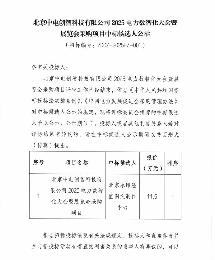 北京中電創(chuàng)智科技有限公司2025電力數(shù)智化大會(huì)暨展覽會(huì)采購項(xiàng)目中標(biāo)候選人公示