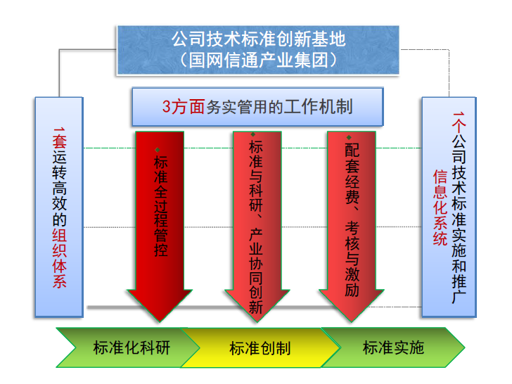 該創(chuàng)新基地基于2019籌建工作基礎(chǔ),進(jìn)一步健全了“1+3+1”組織體系和工作機(jī)制(即:以搭建一套運(yùn)轉(zhuǎn)高效的組織體系為核心,以構(gòu)設(shè)“標(biāo)準(zhǔn)全過程管控,標(biāo)準(zhǔn)與科研、產(chǎn)業(yè)協(xié)同創(chuàng)新,配套經(jīng)費(fèi)、考核與激勵(lì)”三方面務(wù)實(shí)管用的工作機(jī)制為抓手,以建設(shè)完善一個(gè)公司技術(shù)標(biāo)準(zhǔn)實(shí)施和推廣信息化系統(tǒng)為依托,統(tǒng)籌推進(jìn)創(chuàng)新基地各項(xiàng)任務(wù))。完善“標(biāo)準(zhǔn)全過程管控,標(biāo)準(zhǔn)與科研、產(chǎn)業(yè)協(xié)同創(chuàng)新,配套經(jīng)費(fèi)、考核與激勵(lì)”三方面工作機(jī)制。搭建了國(guó)家電網(wǎng)公司技術(shù)標(biāo)準(zhǔn)體系本地?cái)?shù)據(jù)庫(kù)和技術(shù)標(biāo)準(zhǔn)實(shí)施評(píng)價(jià)信息化平臺(tái),完成公司制度標(biāo)準(zhǔn)智能管理平臺(tái)建設(shè),構(gòu)建了首個(gè)電力行業(yè)標(biāo)準(zhǔn)與制度知識(shí)圖譜庫(kù),初步形成“電網(wǎng)全業(yè)務(wù)神經(jīng)網(wǎng)絡(luò)”