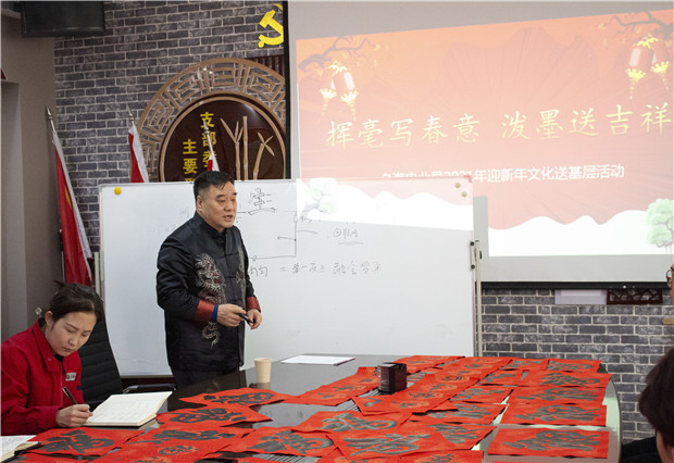活動(dòng)中不僅觀看了書(shū)法大家揮灑自如、展示書(shū)法魅力的書(shū)寫(xiě),還激發(fā)了職工學(xué)習(xí)書(shū)法的熱情。宋主席隨即在現(xiàn)場(chǎng)進(jìn)行了書(shū)法授課,宋主席用四句話講述了書(shū)法要點(diǎn):分割均勻、舉一反三、學(xué)會(huì)分析、穿插移正。精準(zhǔn)的教授,讓現(xiàn)場(chǎng)的青工們躍躍欲試,紛紛拿起手中的毛筆開(kāi)始練了起來(lái)。青工程斌斌說(shuō):“宋主席的授課讓我找出了自己在書(shū)法中可以進(jìn)步的地方,平常忙于工作,每次想學(xué)習(xí)一下書(shū)法都沒(méi)有時(shí)間,這次這個(gè)機(jī)會(huì)太好了!”新入職員工也表示宋主席的書(shū)法飄若浮云,矯若驚龍,字里行間流露出對(duì)分局員工真切的祝福,讓我們心里暖暖的。聲聲問(wèn)候,情暖人心,送春聯(lián)的同時(shí)也將溫暖送到了分局員工的心里,為即將到來(lái)的春節(jié)增添了濃濃的喜慶氛圍,分局職工接過(guò)寫(xiě)滿祝福和美好祝愿的春聯(lián),喜悅之情溢于言表。