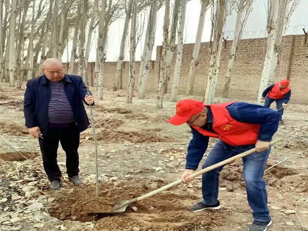 上午十點(diǎn),春風(fēng)送爽,天氣宜人。20余名員工按照分工要求,同志們迫不及待地拿起鐵鍬開(kāi)始鏟土,認(rèn)真細(xì)致地挖著樹(shù)苗和土坑,一陣緊張的忙碌過(guò)后,大家將樹(shù)苗立在土坑上面,扶好樹(shù)苗,精心的完成著從挖坑、放樹(shù)、填土、踩實(shí)到最后澆水的每一個(gè)步驟,有條不紊,很快一棵樹(shù)苗站立起來(lái)。